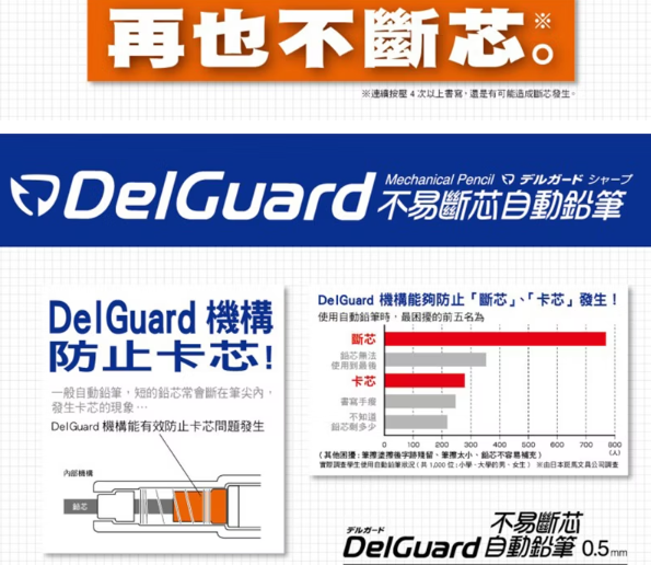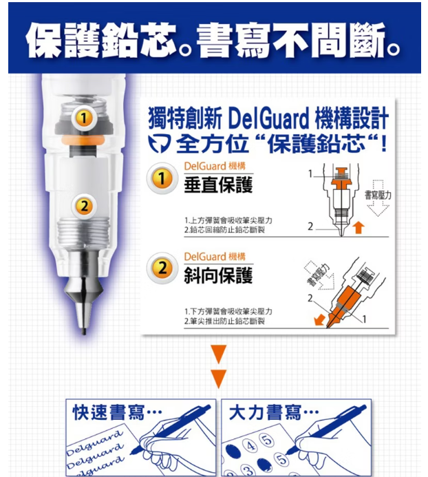 •創新DelGuard雙向保護筆芯機構設計,筆桿內加裝彈簧,發揮垂直及橫向保護效果