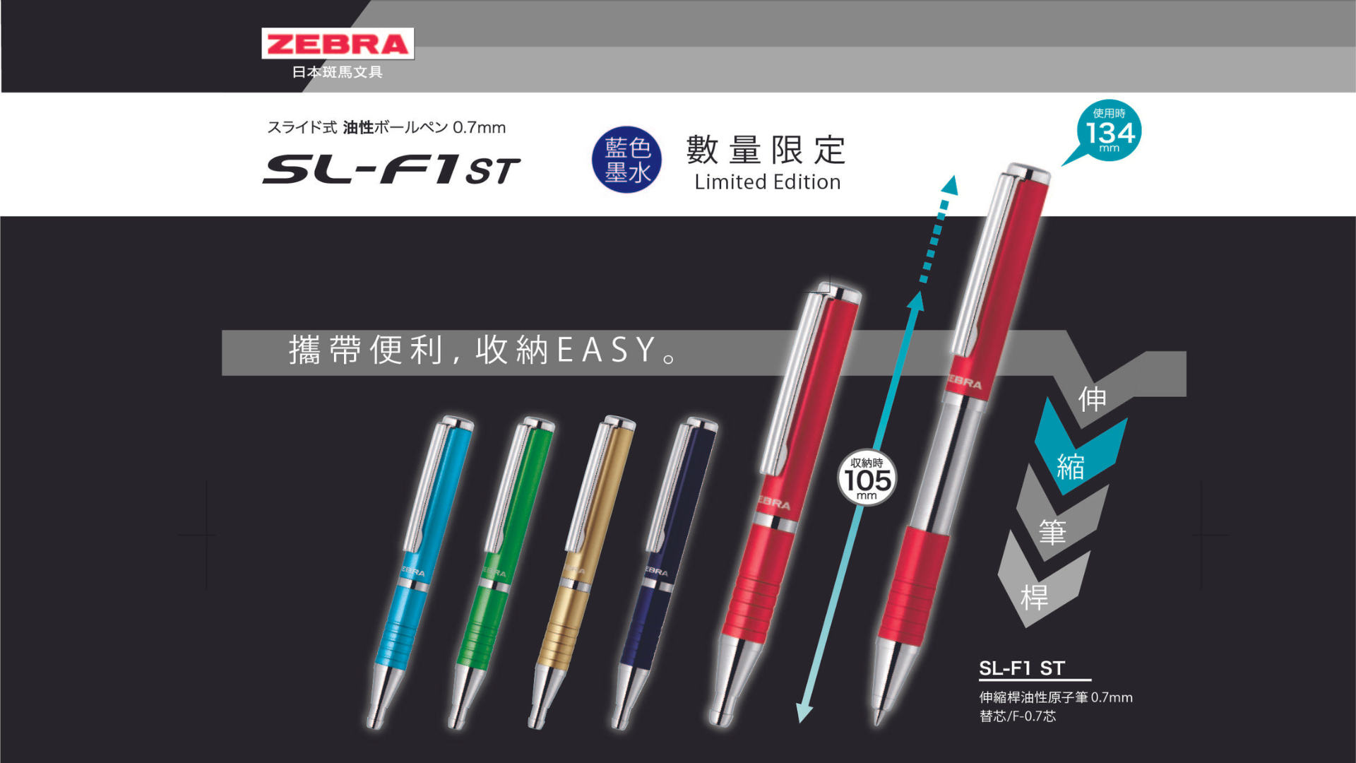 SL-F1 BA115-A1伸縮原子筆的筆桿有綠、紅、海軍藍、金、藍綠5色可供選擇,筆桿未展開前10.5公分長,展開後長約13.3公分,最大的看點就是展開後一如正常尺寸的筆具,好握又好書寫,最適合隨時需要速記的工作者。這款伸縮桿原子筆有替芯銷售,
